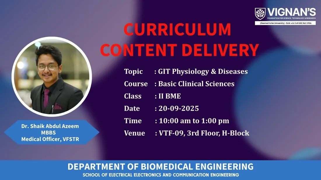 The Project Expo, hosted by VFSTR on 15th September, the Biomedical Engineering students showcased a variety of innovative healthcare projects focused on improving future health solutions. The projects included wearable health monitors, rehabilitation devices, and advanced diagnostic systems, all designed to address current medical challenges with the application of engineering principles. Students actively engaged with their peers, faculty, and visitors, explaining their work in detail and demonstrating the real-world potential of their solutions. The event was attended by esteemed guests, Dr. H. G. Chandrashekar and Prof. M. Venkateshwarlu, who expressed their admiration for the students' creativity, technical expertise, and the significant impact their innovations could have on the healthcare industry. The expo served as a platform for students to gain valuable feedback and showcase their ability to apply technology for the betterment of healthcare, making it a successful and impactful event.