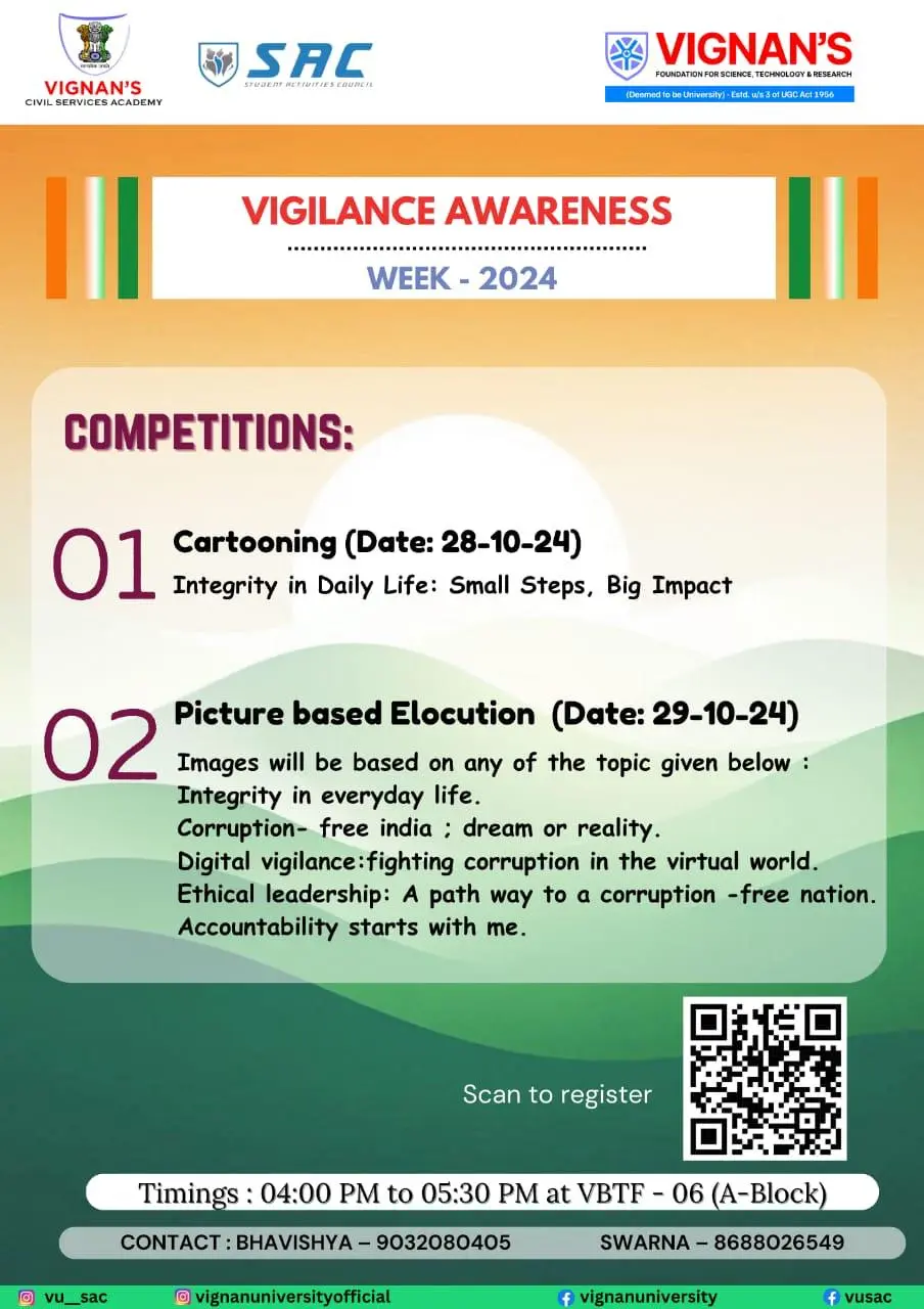 In a vibrant celebration of India's 78th Independence Day, Vignan’s Civil Service Academy, in collaboration with the Dean of Students Affairs, organized a series of engaging events that showcased the talents and patriotism of the student community. The festivities included a diverse array of competitions such as essay writing, elocution, quiz, mock parliament, JAM (Just A Minute), and a traditional attire fashion show, each designed to foster a deeper understanding of India's rich cultural heritage and democratic values. One of the highlights of the celebration was the Freedom Wall, where students expressed their thoughts and ideas on independence and national pride through inspiring messages and artwork. Additionally, a photobooth was set up, capturing memorable moments of the day and adding a fun, interactive element to the event. The traditional attire fashion show was a visual treat, with students proudly displaying the diverse cultural attire from different regions of India. The mock parliament session, a key attraction, provided a platform for students to debate and discuss the issue of “Violence vs Non-Violence in India’s Freedom Struggle”, simulating the democratic process in a lively manner. The competitions were well-received, with active participation from students across various departments. The winners were recognized and celebrated, adding to the spirit of camaraderie and patriotism that marked the occasion. The event was a grand success, reflecting the university's commitment to nurturing well-rounded individuals who are not only academically proficient but also deeply rooted in the values of democracy and cultural diversity.